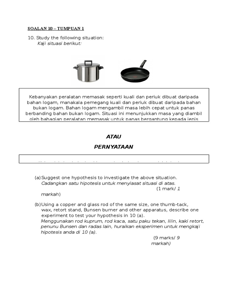Soalan 1Rajah 1 menunjukkan suatu eksperimen untuk mengkaji kesan suhu terhadap pertumbuhan bakteria Bacillus subtilisSelepas dua hari keadaan bubur nutrien dalam setiap tabung uji diperhatikan. 1 markah b Nyatakan pembolehubah bagi eksperimen ini. Satu soalan tingkatan 4 Satu soalan tingkatan 5 Pilih salah satu Contoh soalan 11a nyatakan empat fizikal logam dan bukan logam -buat dalam bentuk jadual Sifat fizikal logam Bukan logam Contoh soalan 11.